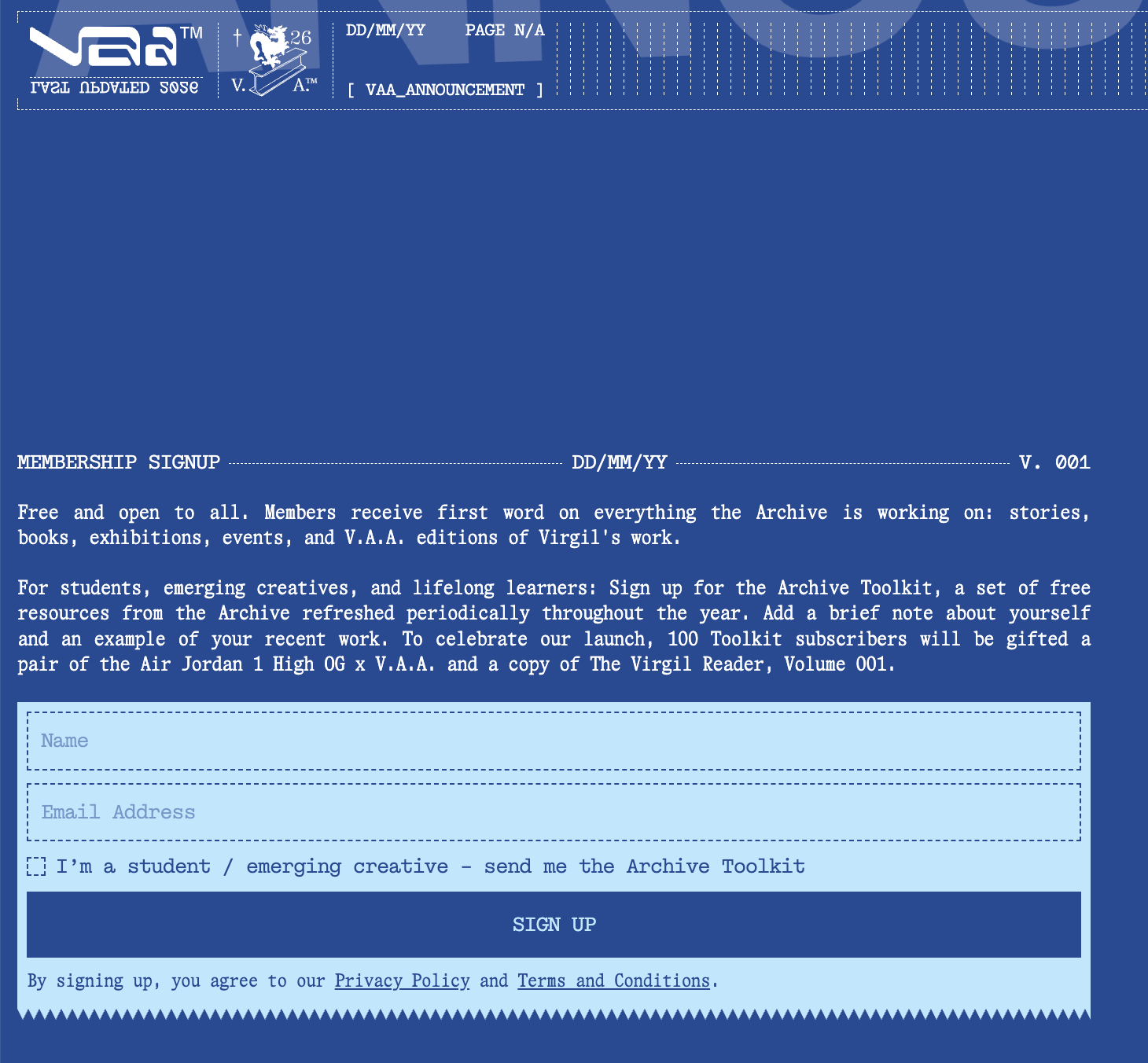 March 12th: The V.A.A.™ WORLD’S FAIR is officially reloaded! 🌎 Celebrating the Virgil Reader Vol 001 and the highly anticipated V.A.A. AJ1, the tour kicks off in Los Angeles this weekend (March 14-15) at ARCHITECTURE (8010 Melrose Ave). While the event runs from 11 AM to 6 PM, please note that the AJ1 will be available exclusively via online raffle for LA locals powered by EQL—there will be no in-person purchases on-site. Stay tuned as the fair moves on to HK, NYC, London, Paris, Tokyo, and Chicago! 🕊️✨